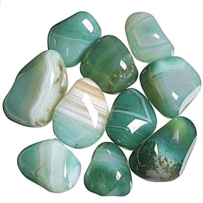 Tromlované leštěné kamínky zeleného barveného achátu na výrobu kamenné bižuterie a další dekorativní účely.