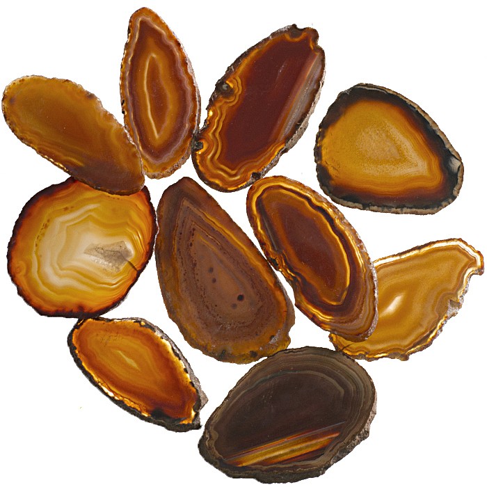 Tenké leštěné plátky cihlového barveného achátu na kreativní tvorbu bytových dekorací, bižuterie a další použití.