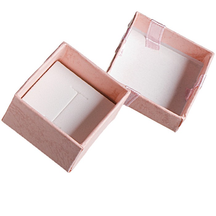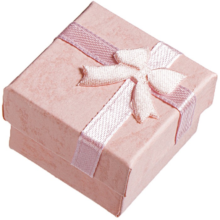 Krabička z kartonu potažená papírem růžové barvy s mašličkou. Uvnitř krabičky je bílý molitanový polštářek.