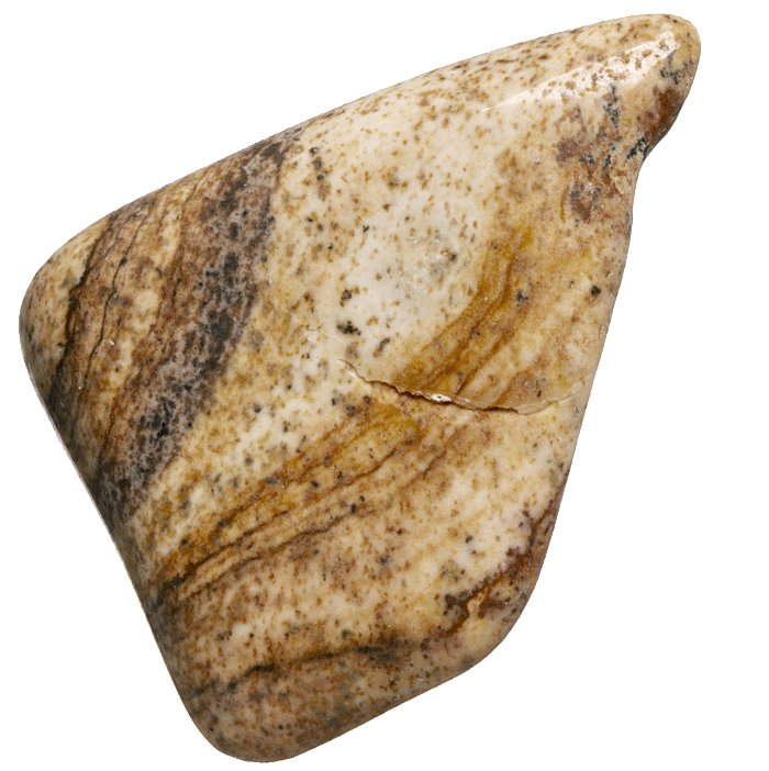 Tromlovaný kamínek obrázkového jaspisu na tvorbu kamenné bižuterie, dekorací nebo do sbírky minerálů.