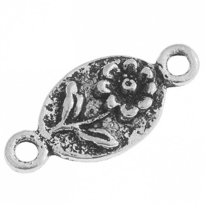 Kovové konektory barvy starostříbro s tvarovanou kytkou.