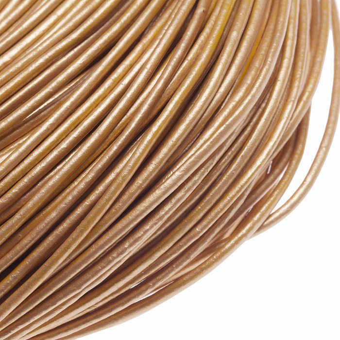Kulatý řemínek o průměru 1,5 mm. Odstín béžový s perleťovým efektem, kruhový průřez.