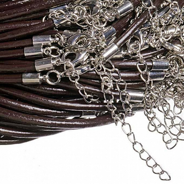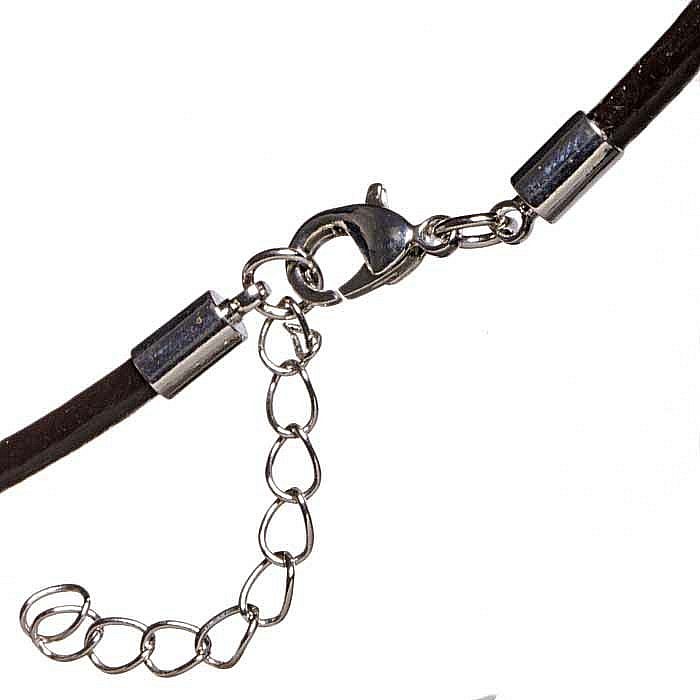 Ukončená šňůrka z pravé kůže o průměru 2 mm se zapínáním v platinové barvě a o délce 47 cm + 5 cm adjustační řetízek.