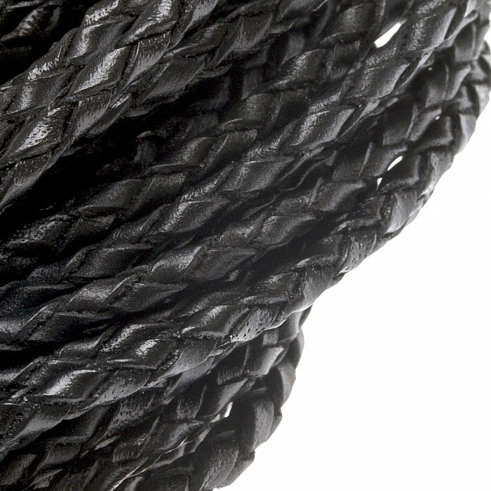 Černý oplétaný kožený řemínek s pevným jádrem z pružného nylonového lanka. Průměr 4 mm.