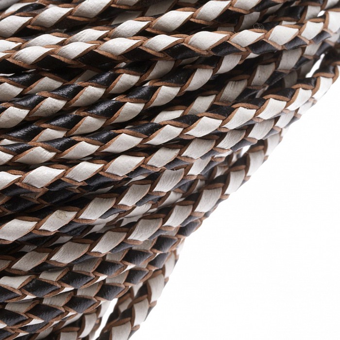 Černobílý splétaný kožený řemínek o průměru 3 mm.