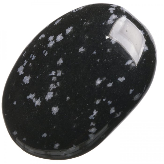 Tromlovaná placička z vločkového obsidiánu vhodná do šperku, jako masážní kámen nebo hmatka.