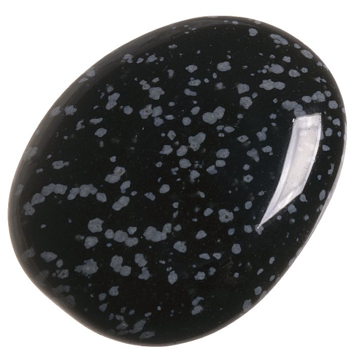 Tromlovaná placička z vločkového obsidiánu vhodná do šperku, jako masážní kámen nebo hmatka.