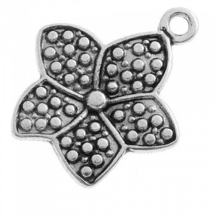Kovové jednostranné přívěsky platinové barvy ve tvaru květiny.