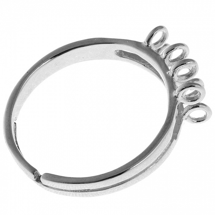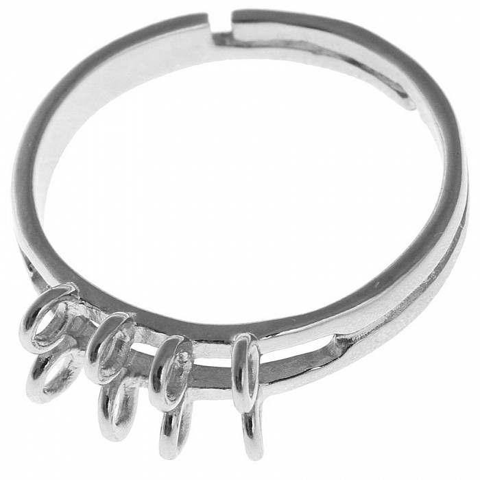 Kovový prstýnek, polotovar s osmi očky, platinové barvy. Prstýnek je nastavitelný, nejmenší vnitřní průměr je 17 mm.
