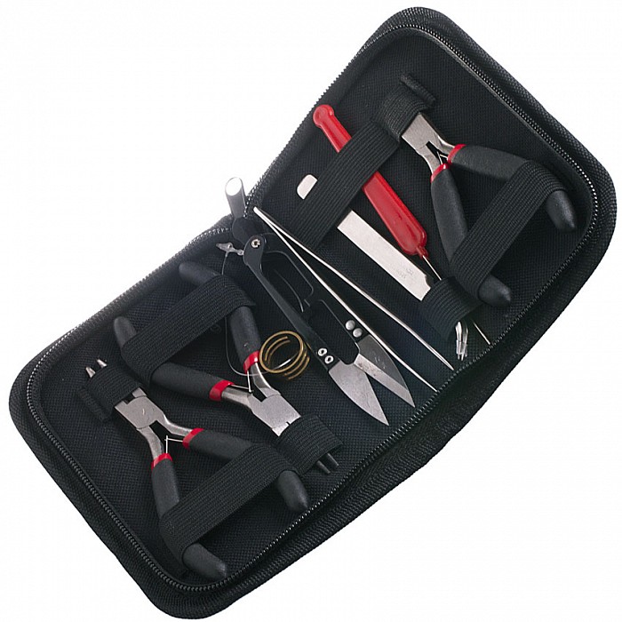 Sada malých šperkařských nástrojů v cestovním pouzdře.