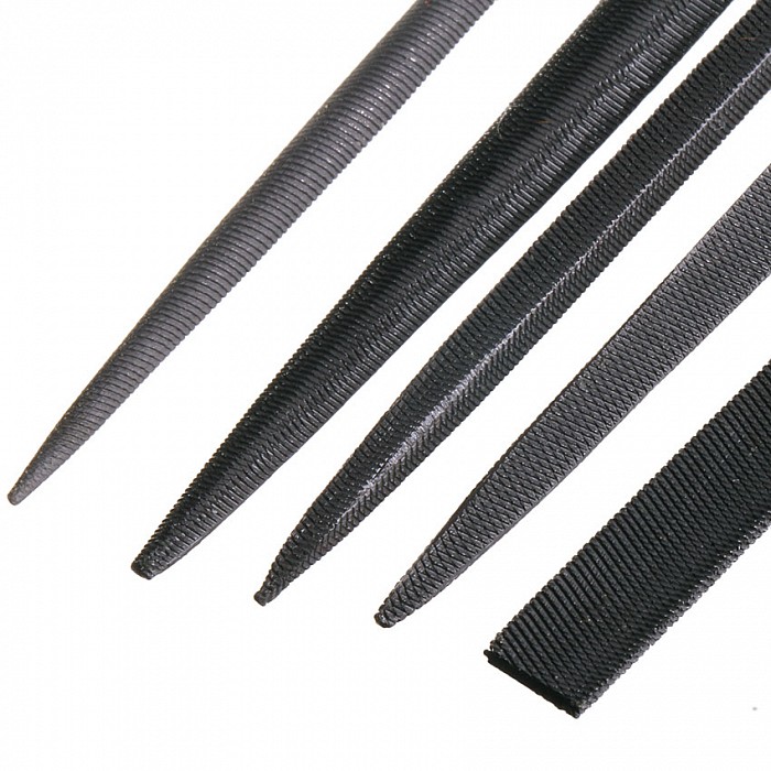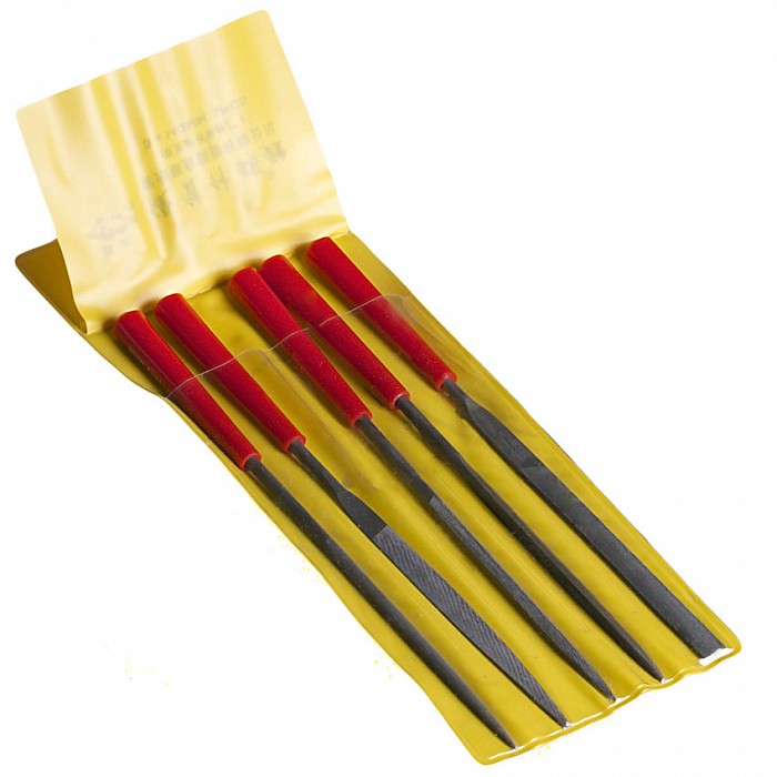 Sada malých ocelových šperkařských pilníčků na kov. Sada obsahuje pilník kulatý, půlkulatý, plochý, trojhraný, čtyřhraný. Pilníky mají plastovou rukojeť, brusnou plochu 65 mm.