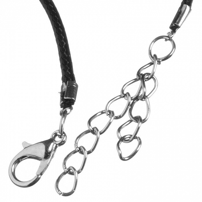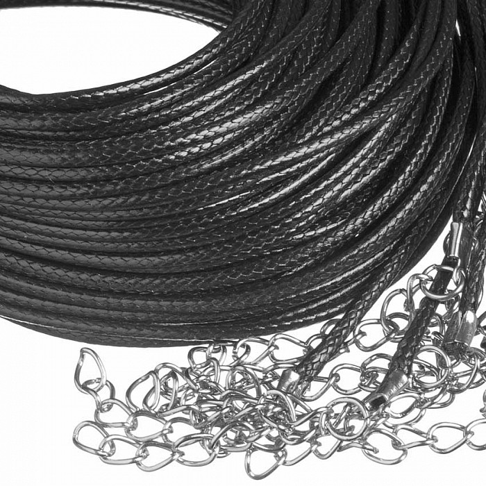 Ukončená voskovaná bavlněná šňůrka o průměru 1,5 mm se zapínáním v platinové barvě a v délce 44 cm + prodlužující řetízek cca 5 cm.