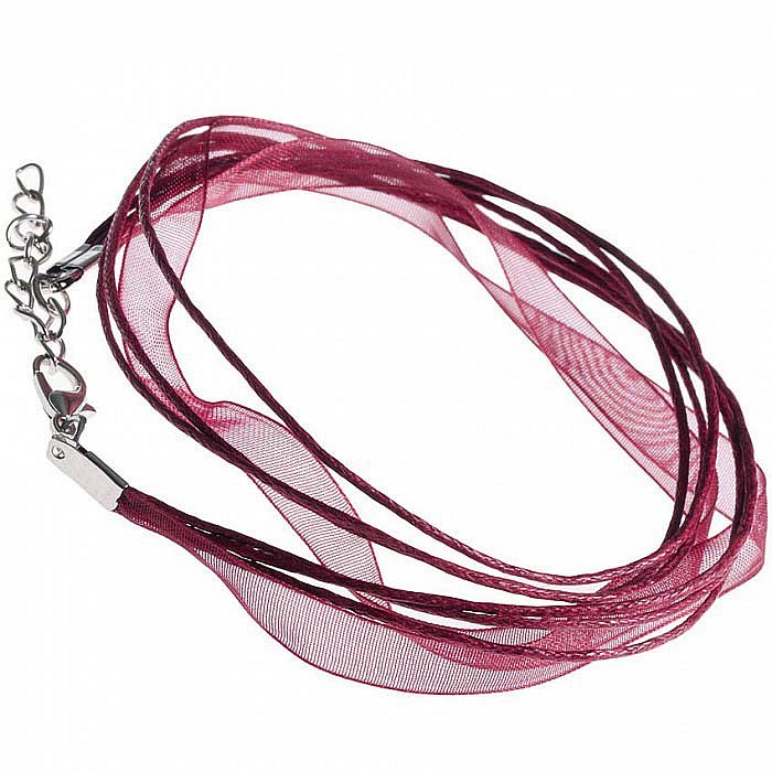 Návlek je dlouhý 45 cm+5 cm prodlužující řetízek a je tvořen ze 3 voskovaných šňůrek a jedné šifonové stuhy v bordó odstínu široké 7 mm.