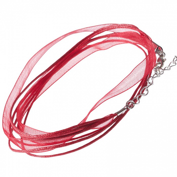 Návlek je dlouhý 45 cm+5 cm prodlužující řetízek a je tvořen ze 3 voskovaných šňůrek a jedné šifonové stuhy v červené barvě široké 7 mm.