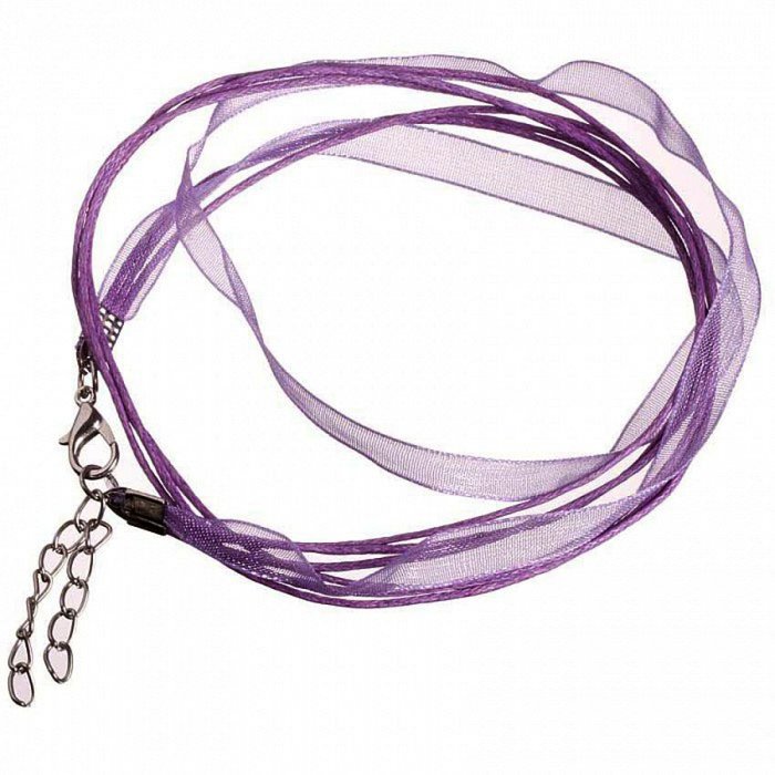 Návlek je dlouhý 45 cm+5 cm prodlužující řetízek a je tvořen ze 3 voskovaných šňůrek a jedné šifonové stuhy fialové barvy široké 7 mm.