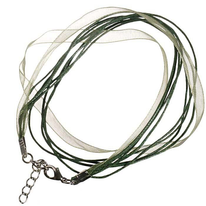 Návlek je dlouhý 45 cm+4 cm prodlužující řetízek a je tvořen ze 4 voskovaných šňůrek a jedné šifonové stuhy široké 7 mm.